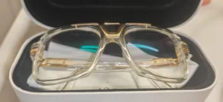 Gafas de la marca CAZAL con un diseño llamativo. - Montura transparente con detalles dorados. - Lentes con un toque multicolor. Cuenta con aumento en el lente.