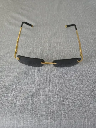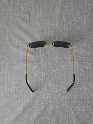 Gafas de sol con montura dorada y lentes negras. - Diseño moderno sin montura. - Patillas doradas con detalles negros.