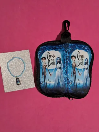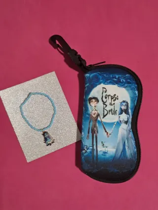 Set de funda de gafas con diseño de El Cadáver de la Novia y una pulsera a juego. - funda con cremallera y mosquetón. - Pulsera con cuentas y colgante. - Diseño inspirado en la película El Cadáver de la Novia.