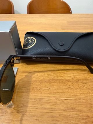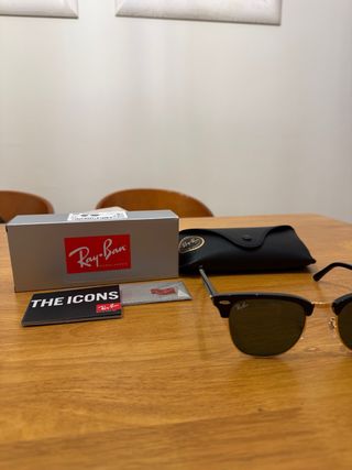 Gafas de sol Ray-Ban Clubmaster con montura en negro y detalles dorados. Incluyen su caja original y funda. - Montura icónica Clubmaster. - Lentes con tinte oscuro. - Incluye funda protectora. - Caja original Ray-Ban.