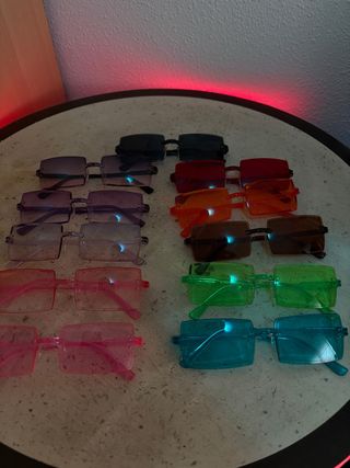 Pack de cinco pares de gafas de sol con montura cuadrada y lentes de colores. - Montura de plástico. - Diseño moderno y llamativo.