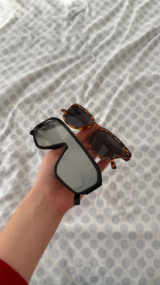 Dos pares de gafas de sol con monturas de diferentes estilos. - Unas gafas con montura negra y lentes espejadas. - Otras gafas con montura de carey y lentes oscuras.
