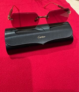 Elegantes gafas de sol Cartier con un diseño moderno y sofisticado. El estuche negro con el logo de Cartier está incluido. - Montura dorada. - Lentes de color marrón - Diseño sin montura.