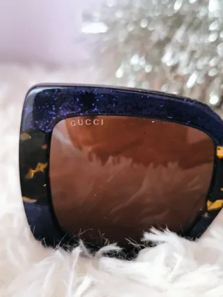 Gafas auténticas de sol con un diseño llamativo y moderno. - Montura con acabado brillante azul oscuro y detalles en carey. - Lentes oscuras para protección. - Logo de Gucci grabado discretamente en la lente. No tiene su funda. Escucho ofertas