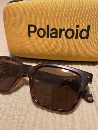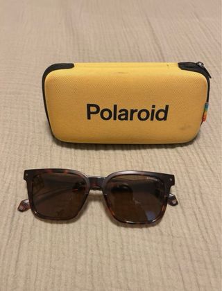 Gafas de sol Polaroid en buen estado, con un diseño moderno y elegante. - Montura de color marrón y multicolor. - Incluye funda protectora.
