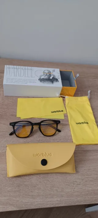 Gafas de la marca Warblue, modelo Galileo, diseñadas para filtrar la luz azul. Gafas para uso diurno en interiores, uso de pantallas, gaming, etc. - Montura negra. 142x45x152. - Lentes con filtro amarillo. - Incluye funda protectora amarilla. - Incluye paño de limpieza amarillo. - Incluye caja original. - Incluye QR con estudio certificado que verifica su propósito.