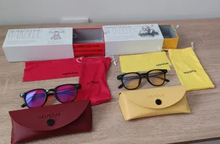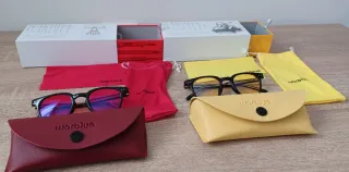 Pack de gafas certificadas para bloquear la luz azul. Incluye dos pares de gafas, modelo Galileo para uso diurno y modelo Da Vinci para nocturno. Bloqueo de luz azul de pantallas, luminarias, etc. - Gafas de montura negra. - Fundas y paños de limpieza de color acorde al modelo. - Bolsas de tela para guardar las gafas. - Cajas originales. - Incluyen QR de estudio certificado.