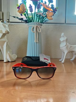 Vendo gafas de sol Ray-Ban modelo New Wayfarer RB2132 en una combinación de colores muy exclusiva: exterior azul marino e interior naranja vibrante. Estado: Impecables, sin marcas en los cristales ni en la montura. Autenticidad: 100% originales. Se puede ver el grabado de y el código de modelo en las patillas. ¿Qué incluye?: Gafas, estuche de cuero original, paño de limpieza Ray-Ban y caja original con etiqueta de autenticidad de Luxottica. Talla: 52-18 (talla estándar muy cómoda). Entrega en mano en Sevilla o envío protegido por Wallapop.