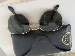Gafas de sol Ray-Ban con montura hexagonal dorada y lentes verdes. Incluyen su funda original. - Montura metálica dorada. - Lentes de cristal verde. - Diseño hexagonal. - Funda de piel negra. Con mascas mínimas de uso