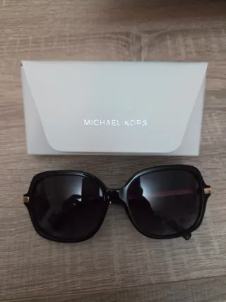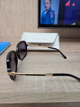 Elegantes gafas de sol Michael Kors. - Montura negra. - Lentes oscuras. - Detalles dorados en las patillas.