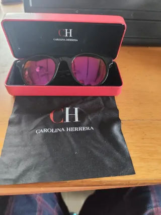 Elegantes gafas de sol Carolina Herrera con montura negra y lentes de espejo rosas. - Montura de acetato. - Lentes con efecto espejo. - Incluye estuche rígido y funda de tela.