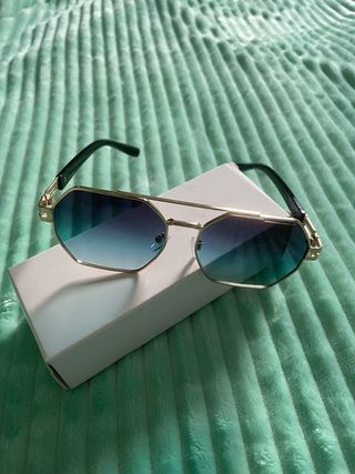 Gafas de sol con un diseño octogonal moderno y montura dorada. - Lentes con degradado de azul a verde. - Patillas oscuras.