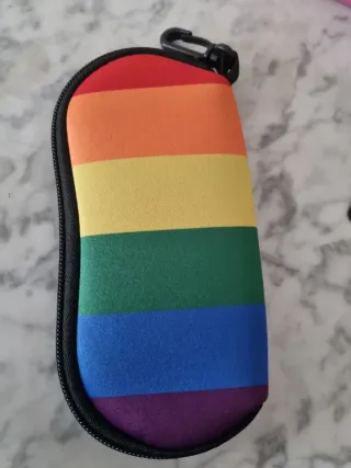 Conjunto de accesorios con diseño arcoíris. - Funda para gafas con cierre de cremallera de Neopreno con cremallera y llavero para poder llevarla colgada en el bolso. - Neceser con estampado de personas y bandera arcoíris. - Pendientes con forma de corazón y love is love.