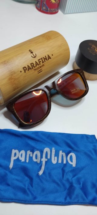 Gafas de sol Parafina con montura de madera de bambú y lentes rojas. Incluyen funda de madera cilíndrica y bolsa de tela. - Montura con diseño de madera. - Lentes con protección UV 400. - Incluye funda de madera grabada. - Bolsa de tela azul con logo.