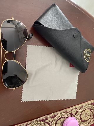 Gafas de sol Ray-Ban con montura dorada y lentes negras. Incluyen funda protectora y paño de limpieza. - Montura metálica dorada. - Lentes con acabado negro. - Funda de cuero sintético. - Paño de microfibra.