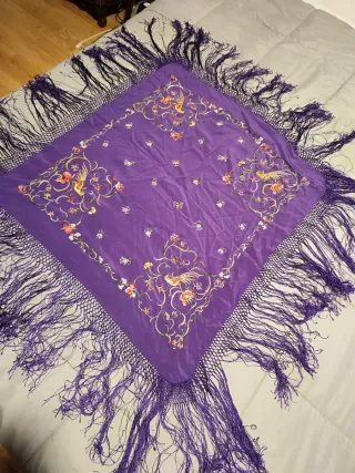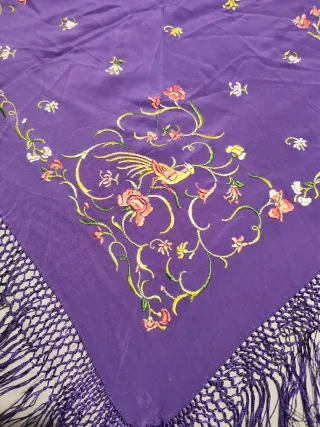 Precioso mantón antiguo con un intrincado bordado floral. Ala de mosca. Tiene partes de la seda pasada, algunos piquetes en la seda. Colores preciosos. Flecos bien, 160 cm - Diseño con flores y motivos vegetales. - Flecos decorativos en los bordados.