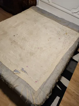 Precioso mantón de Manila antiguo con detalles bordados y flecos. Muy antiguo, 150 años. Tiene manchas, 2 enganchones en la seda y otro en los flecos. Isabelino con 2 esquinas bordadas a mano. - Diseño floral con toques rosados. - Flecos largos y cuidados. - Tejido ligero y vaporoso.