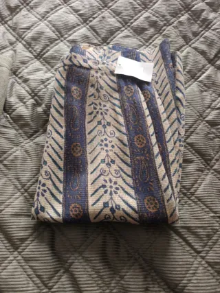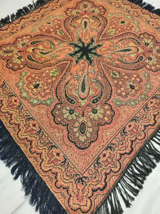 Precioso pañuelo o manto de estilo regional con un diseño intrincado y flecos. Lana, 80x83 cm. Multicolor - Diseño paisley y floral. - Tonos naranjas y negros predominantes. - Flecos en todo el borde.