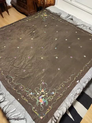 Elegante mantón o pañuelo de Manila en tono marrón, adornado con un intrincado bordado floral multicolor y detalles de flecos en los bordes. Muy antiguo, ala de mosca. Tiene agujeros en la seda y flecos partidos. 2 esquinas bordadas a mano y cenefa alrededor. Más de 150 años de antigüedad - Diseño con motivos florales y vegetales. - Bordado detallado en varios colores. - Flecos en los extremos.