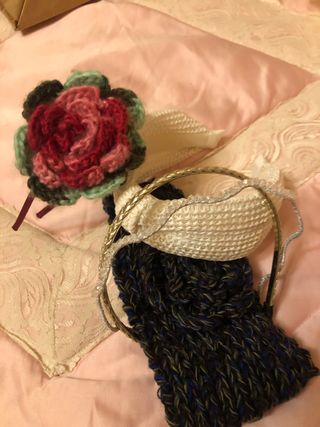 Conjunto de accesorios para el cabello, perfectos para darle un toque especial a tu peinado. - Coletero negro con lazo grande. - Coletero beige adornado con perlas. - Coletero azul de terciopelo con detalles plateados. - Coletero con diseño de flor azul y detalles de cuadros rojos. - Coletero grande de organza en color crema.