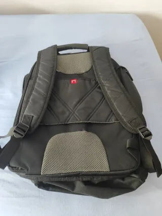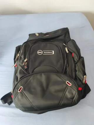 Mochila negra con el logo de Dell PartnerDirect. - Compartimento principal espacioso. - Múltiples bolsillos exteriores con cremallera. - Correas de hombro acolchadas y ajustables. - Asa superior para colgar. - Detalles en color rojo y ojales metálicos.