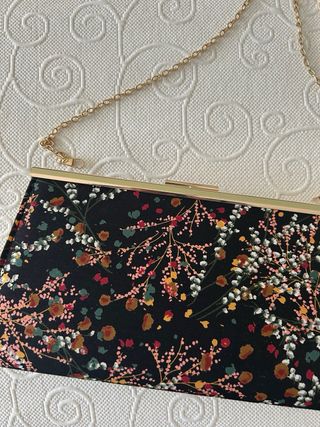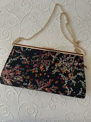 Bolso de mano con un diseño floral muy llamativo, ideal para eventos especiales. - Cierre de broche dorado. - Cadena dorada para llevar al hombro. - Estampado multicolor sobre fondo negro.