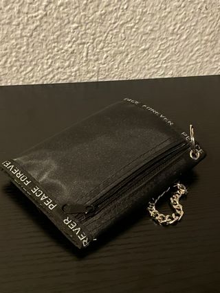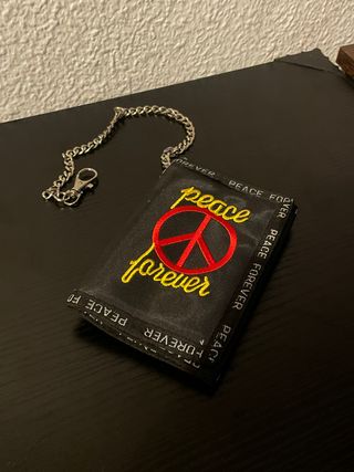 Cartera negra sin estrenar con un diseño llamativo de paz y la palabra forever bordada. - Símbolo de paz bordado en rojo. - Texto peace forever bordado en amarillo. - Borde con texto repetido peace forever. - Incluye cadena metálica con cierre.