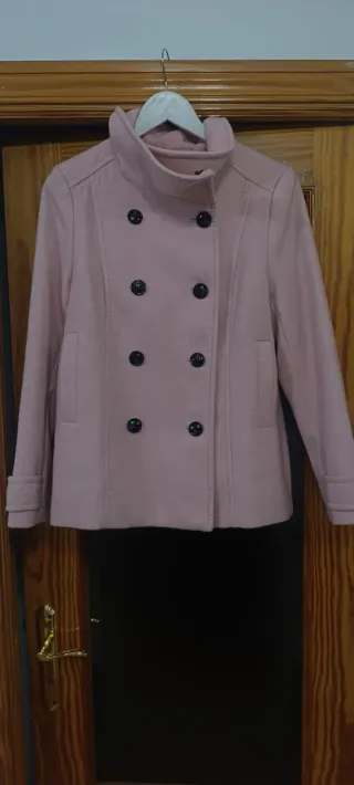 Abrigo corto de color rosa, ideal para el entretiempo. Presenta un diseño de doble botonadura y cuello alto. - Cierre de doble botonadura con botones oscuros. - Bolsillos laterales. - Puños y bajo del abrigo con vuelta.