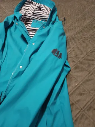 Chubasquero impermeable con forro a rayas. - Diseño náutico. - Cierre de cremallera y botones a presión. - Capucha. - Puños y cuello forrados.