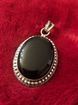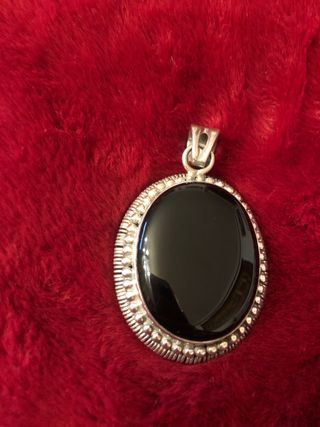 Colgante de gran tamaño con un diseño elegante. - Piedra central de color negro. - Marco y enganche de plata. - Borde decorado con pequeños detalles.