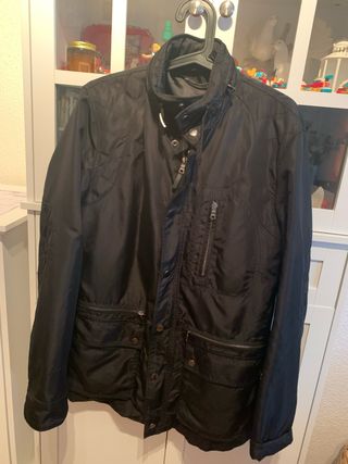 Chaqueta de la marca Zara para hombre, talla M. Diseño moderno y versátil. - Cierre de cremallera frontal. - Cuello alto. - Múltiples bolsillos con cremallera y botón. - Detalle acolchado en hombros. - bolsillos interiores. - Capucha que viene cerrada en la cremallera . - refuerzos en los codos.