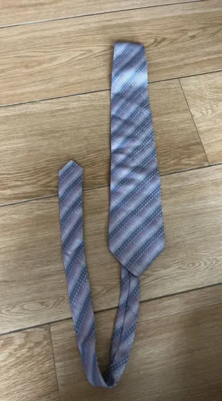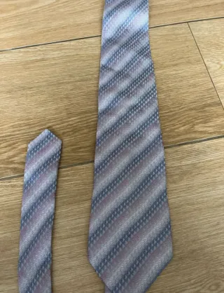 Elegante corbata con un diseño de rayas diagonales. Combina tonos azules y rosados para un look sofisticado. - Diseño de rayas. - Patrón geométrico.