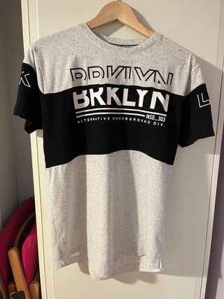 Camiseta de hombre con un diseño moderno y urbano. - Estampado frontal BRKLYN y ALTERNATIVE UNDERGROUND DIV.. - Diseño bicolor con paneles en negro y blanco moteado. - Detalles gráficos en las mangas.