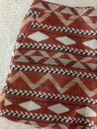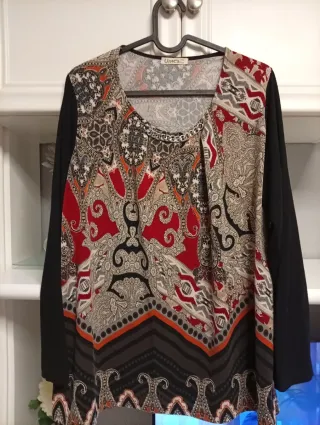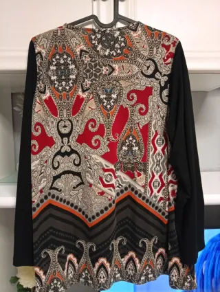 Camiseta de manga larga con un llamativo estampado. - Diseño con escote redondo. - Mangas largas en color negro. - Estampado paisley y geométrico en tonos rojos, beige y negro.