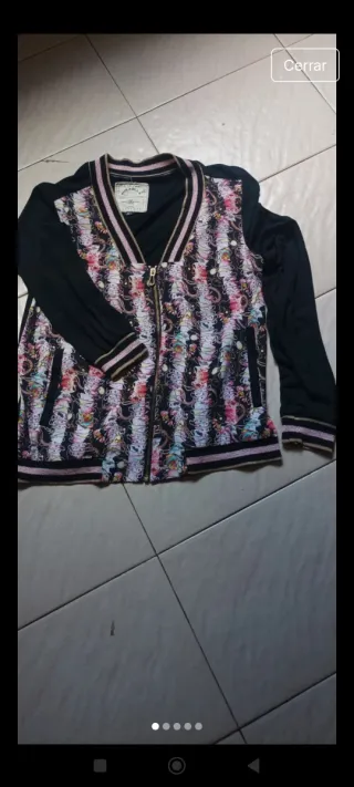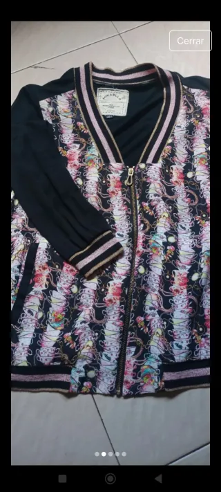 Chaqueta estilo bomber con un diseño vibrante y llamativo.MUY NUEVO - Mangas largas negras. - Cremallera frontal. - Puños y bajo con detalles de rayas. - Bolsillos laterales.