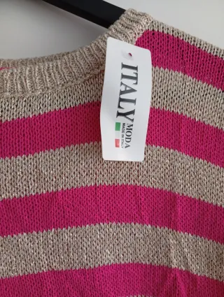 Camiseta de punto para mujer, talla única, perfecto para S y M - Tejido de punto ligero. - Diseño de rayas horizontales. - Manga corta.