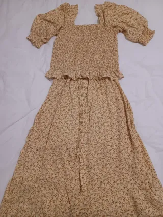 Conjunto de dos piezas con estampado floral. - Top con escote cuadrado y mangas abullonadas. - Falda larga con botones delanteros.