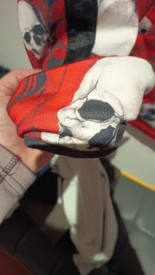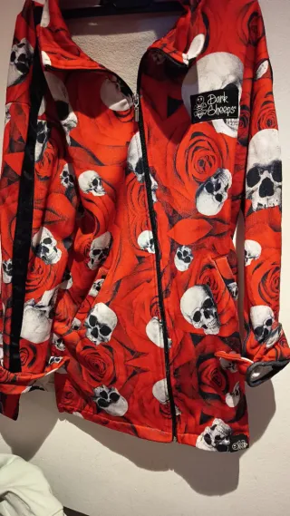 Chaqueta con un llamativo estampado de flores rojas y calaveras blancas. - Diseño frontal con cremallera. - Bolsillos laterales. - Detalle de banda lateral negra.