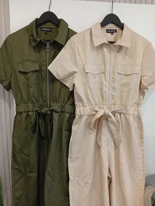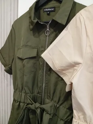 Conjunto de dos monos de mujer, da talla L-XL. Se venden también por separado a 9€ unidad. - Mono de color verde oliva. - Mono de color beige. - Diseño con cremallera frontal. - Cintura elástica con cinturón. - Bolsillos en el pecho y cadera.