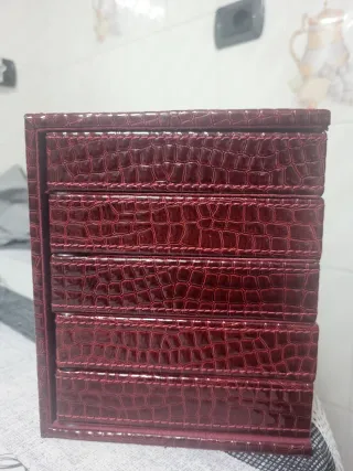 Elegante joyero con cinco pisos, perfecto para organizar tus accesorios. - Diseño con acabado que imita piel de cocodrilo. - Tonos marrones y rojizos que le dan un toque sofisticado.