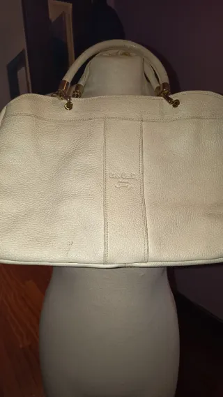 Elegante bolso de mano con un diseño clásico. - Material: Piel texturizada. - Color: Beige con detalles dorados. - Asas de mano. - Compartimento principal.