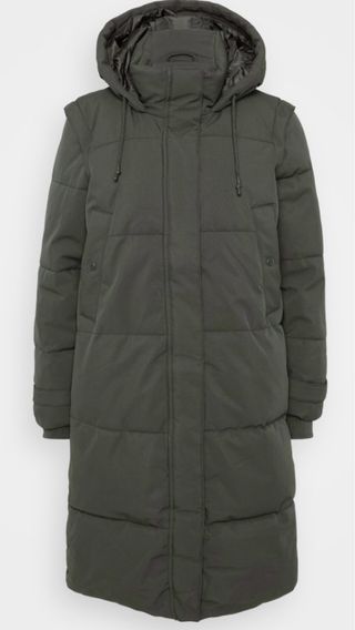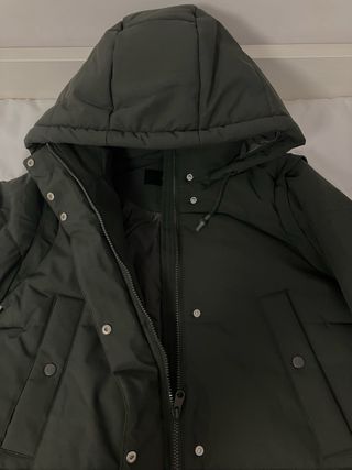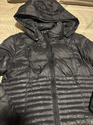 Abrigo acolchado entallado con capucha que se puede quitar mediante uam cremallera. - Cierre de doble cremallera con apertura en zona inferior para mantener cerrado miebtras te sientas. - Bolsillos laterales con cremallera. - Diseño acolchado horizontal en la parte superior y rombos en la inferior. La etiqueta talla como una 44 pwro es como una 42