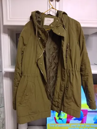 Chamarra estilo parka en color verde, ideal para un look casual. - Cierre frontal con cremallera y botones. - Cintura ajustable con cordón. - Bolsillos frontales con solapa y botón. - Capucha integrada.