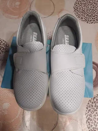 Zuecos de seguridad de la marca SKARPPA. Modelo IRATI 01 SRC - Diseño blanco. - Cierre de velcro. - Material perforado.