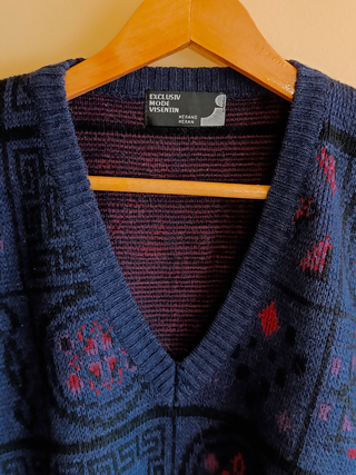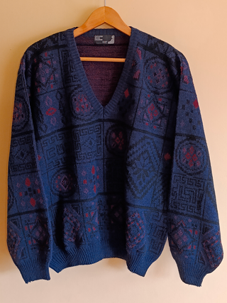 ⚡ Jersey vintage con cuello de pico y estampado geométrico retro. 🏷️ Talla: L Oversize 📏 Medidas: 65cm de largo X 63cm de axilas 🎨 Color: Azul marino, burdeos y negro ✅ Estado: Bueno 🔎 Detalles: Tejido de punto de alta calidad, diseño geométrico clásico, marca Exclusiv Mode Visentin