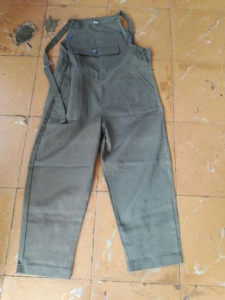 Peto de trabajo o informal en color caqui. Ideal para un estilo cómodo y práctico. - Diseño tipo mono con tirantes. - Dos bolsillos en la parte delantera superior con botón. - Bolsillos laterales. - Cierre con botones a los lados.