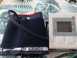 Tensiometro digital para medir la presión arterial. - Brazalete de color azul con borde rojo. - Pantalla digital. - Botones de control. - Indicador de rango OK.
