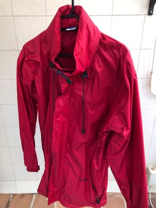 Chubasquero ligero y práctico. - Color rojo vibrante. - Diseño con cuello alto. - Cierre con cremallera y cordones ajustables.