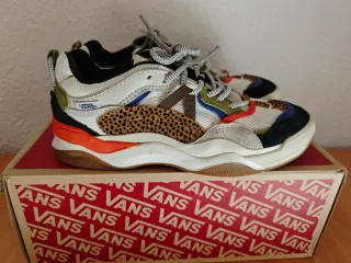 Zapatillas de la marca Vans modelo Varix WC. Están como nuevas, solo las he usado un par de veces. - Combinación de colores blanco, naranja, verde, azul y estampado de leopardo. - Cordones grises. - Suela de goma. #vans #zapatillas #zapatillasvans #vansvarix #animalprint