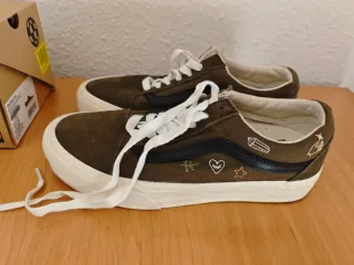 Zapatillas Vans Old Skool Vr3 en color verde con detalles bordados. Como nuevas, muy poco uso. - Diseño único con motivos bordados. - Cordones blancos. - Suela de goma blanca.